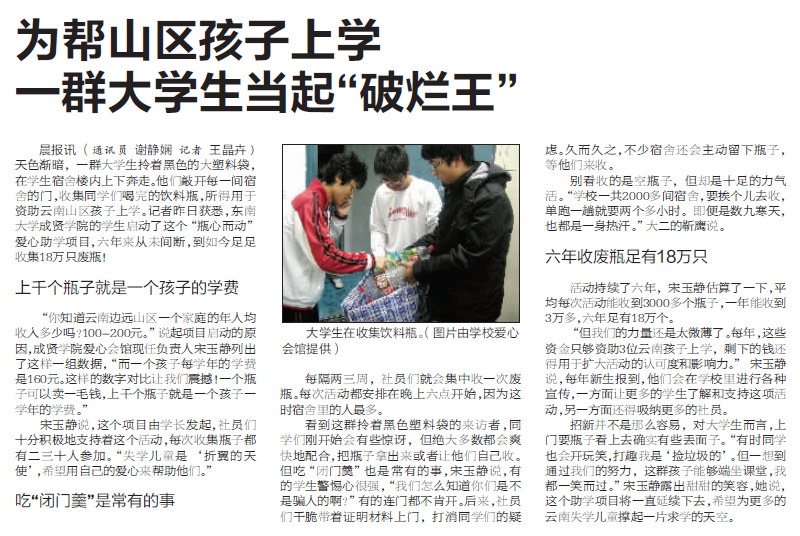 晨报讯(通讯员 谢静娴 记者 王晶卉)天色渐暗,一群大学生拎着黑色的大塑料袋,在学生宿舍楼内上下奔走。他们敲开每一间宿舍的门,收集同学们喝完的饮料瓶,所得用于资助云南山区孩子上学。记者昨日获悉,东南大学成贤学院的学生启动了这个“瓶心而动”爱心助学项目,六年来从未间断,到如今足足收集18万只废瓶!