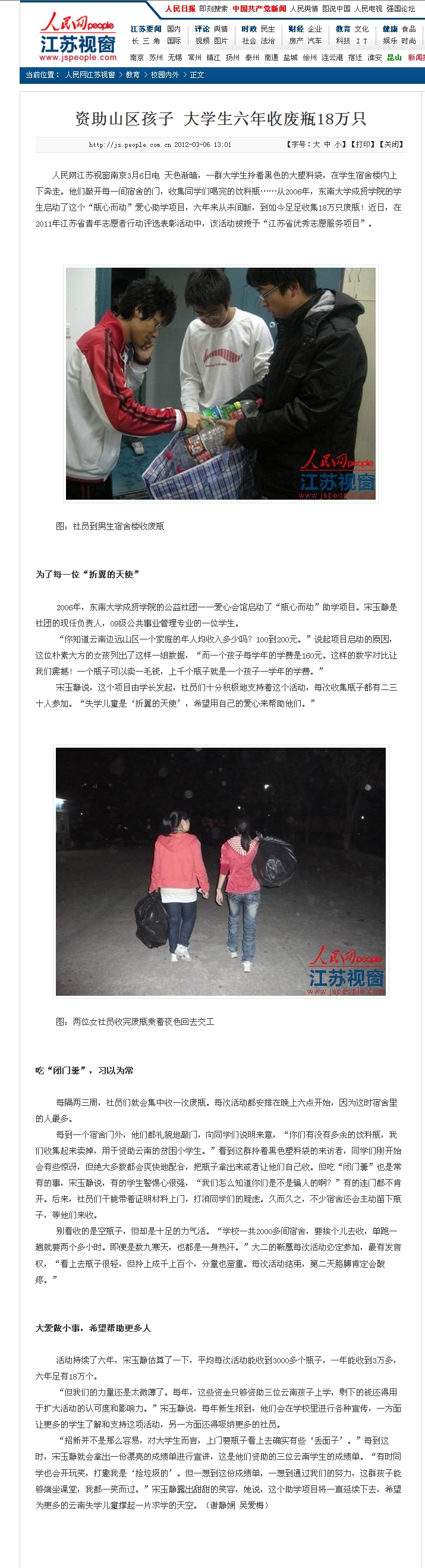 【人民网】资助山区孩子 大学生六年收废瓶18万只