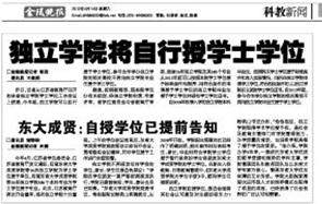 独立学院不再颁发母体学校的学位,家长、学生们是否有异议?“学院的学位颁发一直严格按照规定执行,学院已提前告知,学生、家长也早已知情。”东南大学成贤学院党委书记、常务副院长程明山明确表示,从2008年开始,学院招生简章对此已经作了明确说明,招生宣传时均告知考生、家长,毕业时符合学院学士学位授予暂行条例的学生将颁发东南大学成贤学院的学士学位。在新生入校教育、日常教育管理中,《东南大学成贤学院大学生手册》中,都向学生们强调说明。