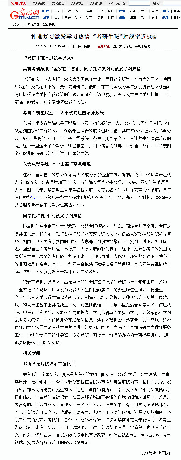 【光明网】扎堆复习激发学习热情,“考研牛班”过线率近50%