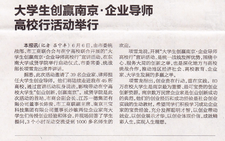【南京日报】大学生创赢南京·企业导师高校行活动举行