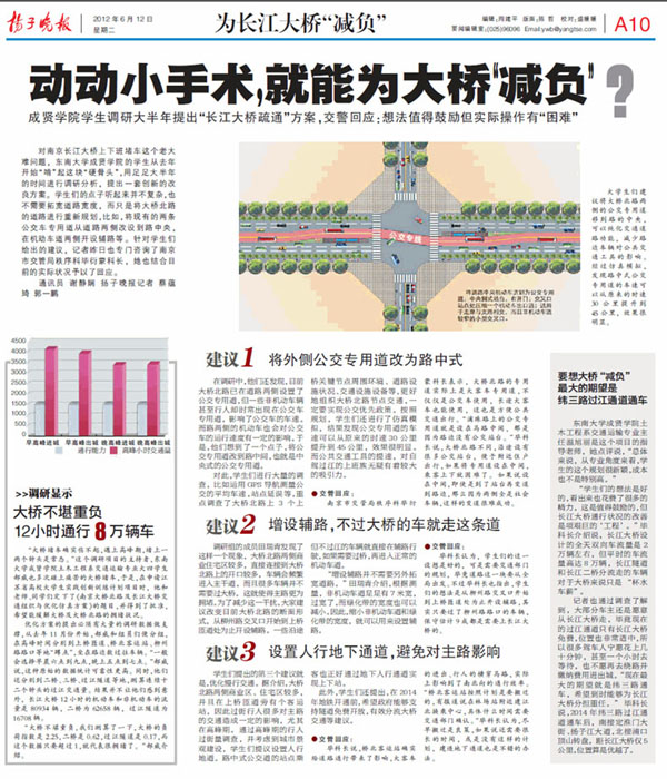 对南京长江大桥上下班堵车这个老大难问题,东南大学成贤学院的学生从去年开始“啃”起这块“硬骨头”,用足足大半年的时间进行调研分析,提出一套创新的改良方案。学生们的点子听起来并不复杂,也不需要拓宽道路宽度,而只是将大桥北路的道路进行重新规划,比如,将现有的两条公交车专用道从道路两侧改设到路中央,在机动车道两侧开设辅路等。针对学生们给出的建议,记者昨日也专门咨询了南京市交管局秩序科毕衍蒙科长,她也结合目前的实际状况予以了回应。