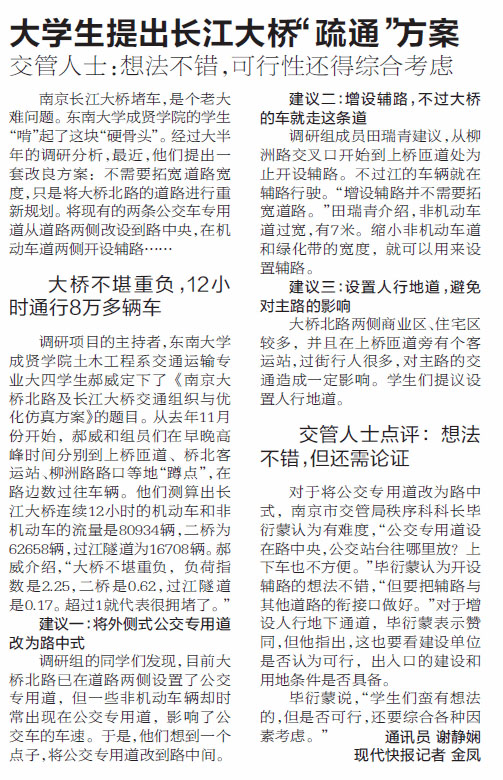 长江大桥堵车,是个老大难问题。东南大学成贤学院的学生“啃”起了这块“硬骨头”。经过大半年的调研分析,最近,他们提出一套改良方案:不需要拓宽道路宽度,只是将大桥北路的道路进行重新规划。将现有的两条公交车专用道从道路两侧改设到路中央,在机动车道两侧开设辅路……