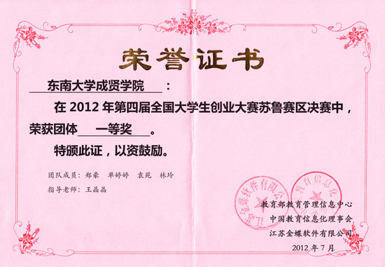 2012第四届全国大学生创业大赛获奖证书