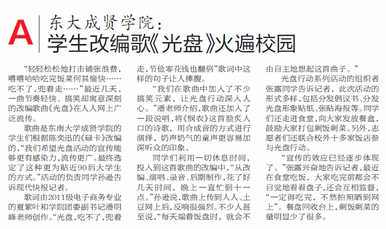 【现代快报】东大成贤学院:学生改编歌《光盘》火遍校园
