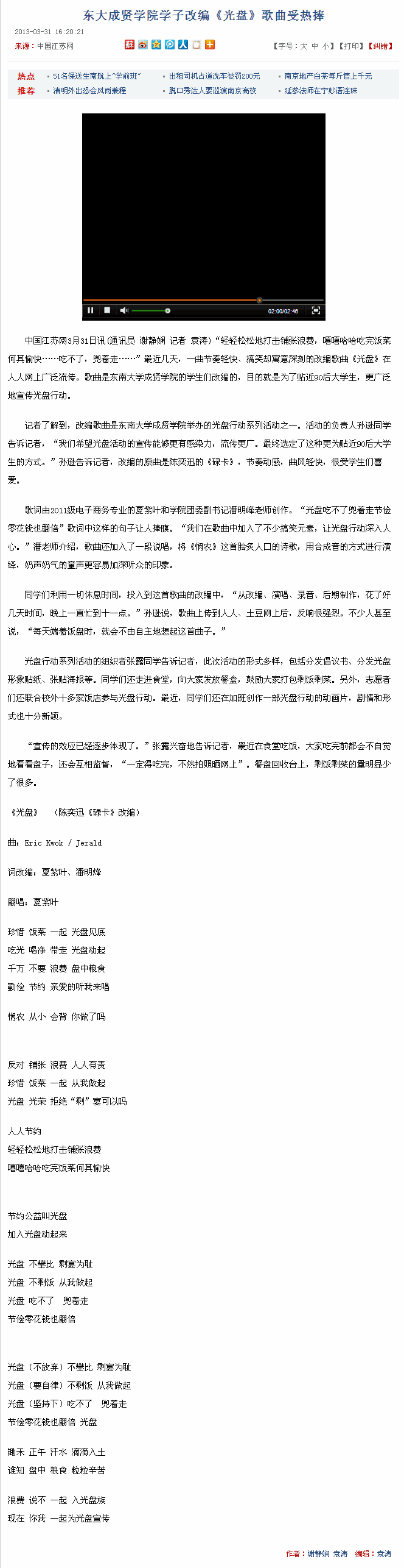 【中国江苏网】东大成贤学院学子改编《光盘》歌曲受热捧