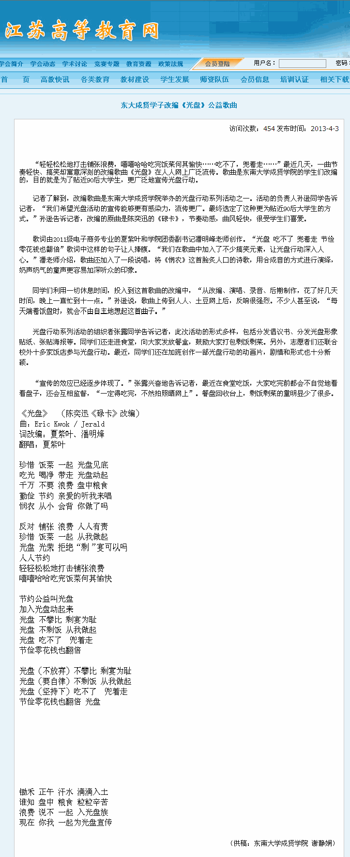 【江苏高等教育网】东大成贤学子改编《光盘》公益歌曲