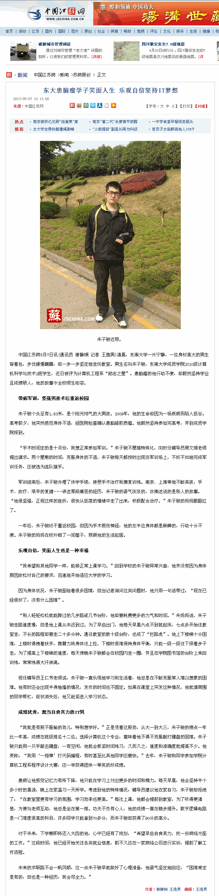 【中国江苏网】东大患脑瘤学子笑面人生 乐观自信坚持IT梦想