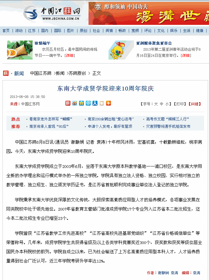 【中国江苏网】东南大学成贤学院迎来10周年院庆
