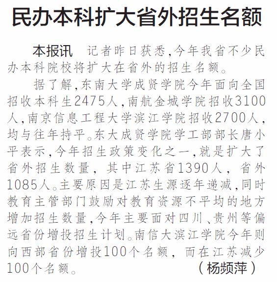 【新华日报】民办本科扩大省外招生名额
