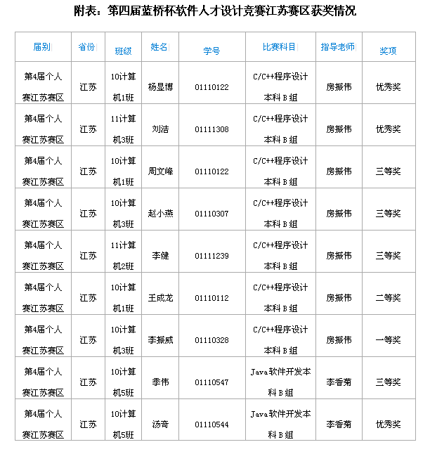 2013年“蓝桥杯•全国软件专业人才设计与开发大赛”江苏赛区的比赛(本科组),我院获江苏省一等奖1名、二等奖1名、三等奖3名、优秀奖3名,计算机工程系房振伟、李香菊老师获“优秀指导教师”荣誉称号。