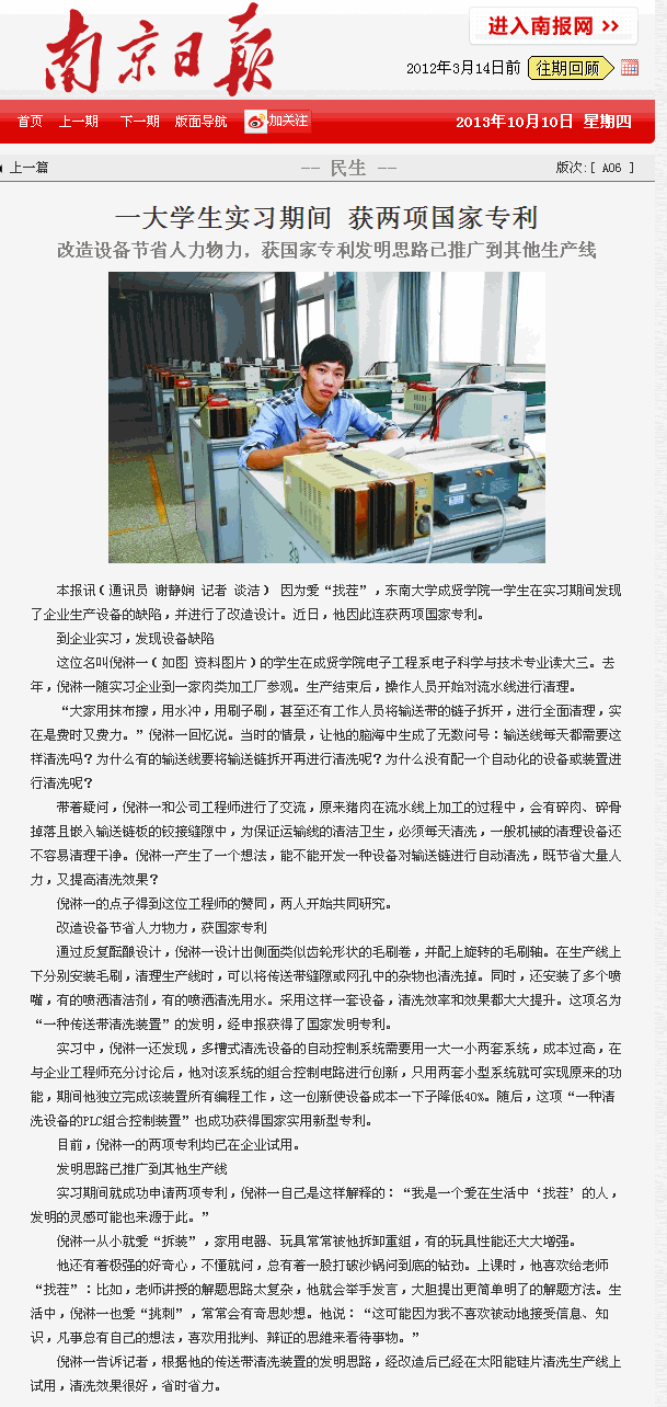 【南京日报】一大学生实习期间 获两项国家专利