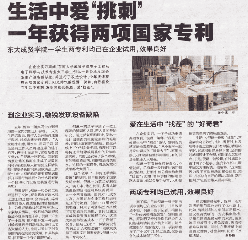 【扬子晚报】生活中爱“挑刺” 一年获得两项国家专利