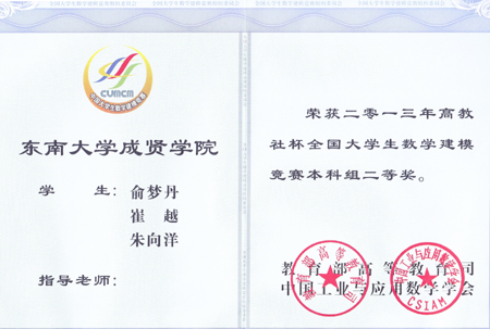第22届全国数学建模竞赛公布比赛中,2011级朱向洋、俞梦丹、崔越喜获全国二等奖,陈凯、陈尹力、刘园园荣获省三等奖,在同类院校中名列前茅。