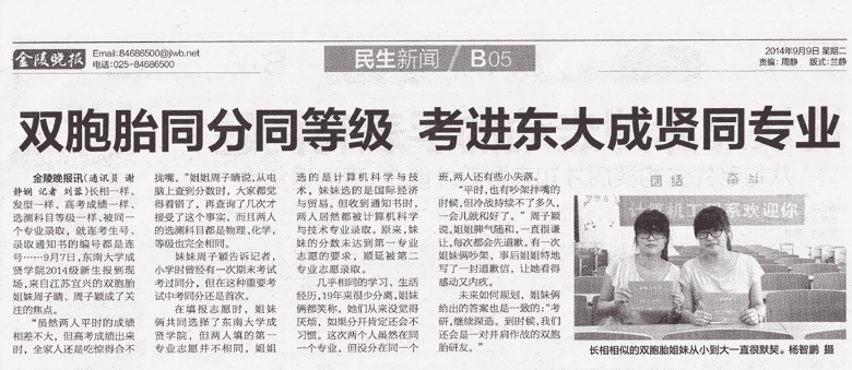 【金陵晚报】双胞胎同分同等级 考进东大成贤同专业