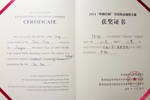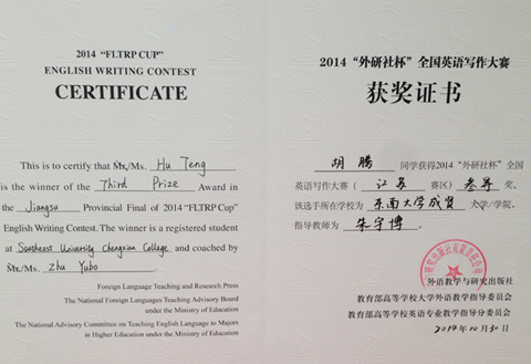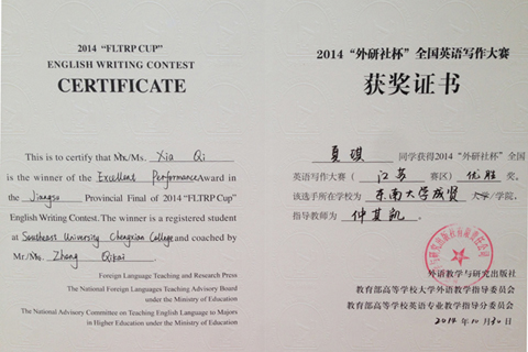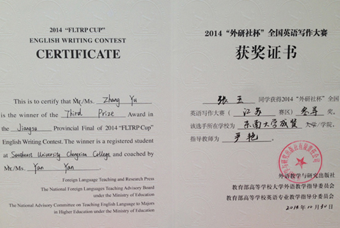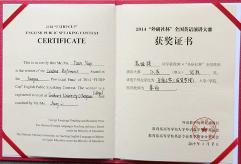 在2014“外研社杯”全国英语写作和演讲比赛中,我院学生均取得优异成绩。