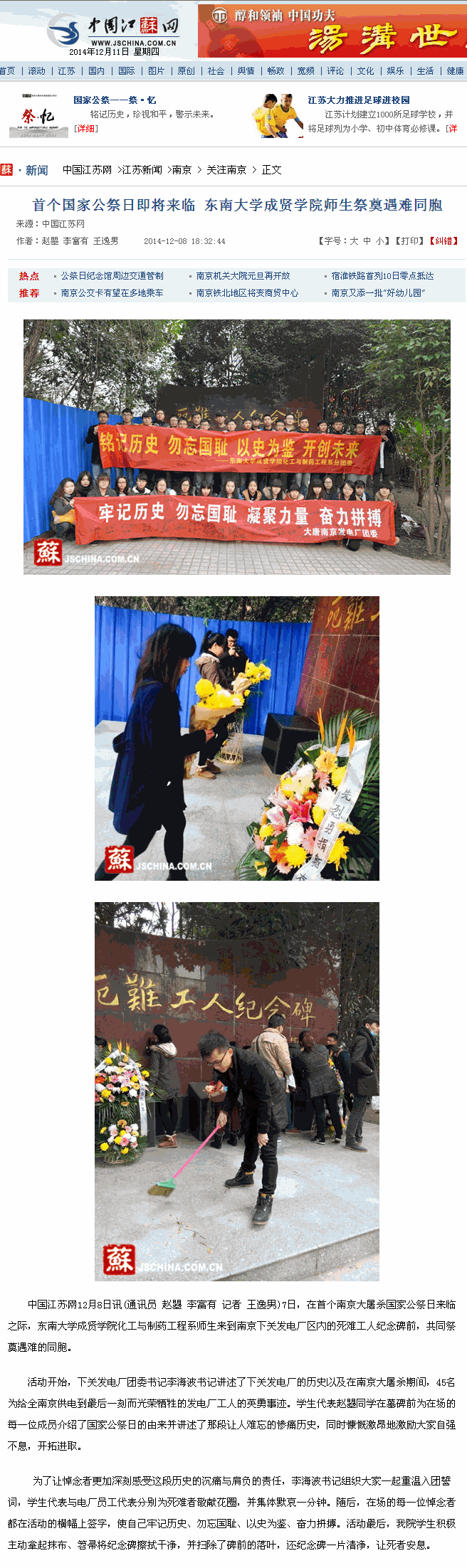【中国江苏网】首个国家公祭日即将来临 东南大学成贤学院师生祭奠遇难同胞