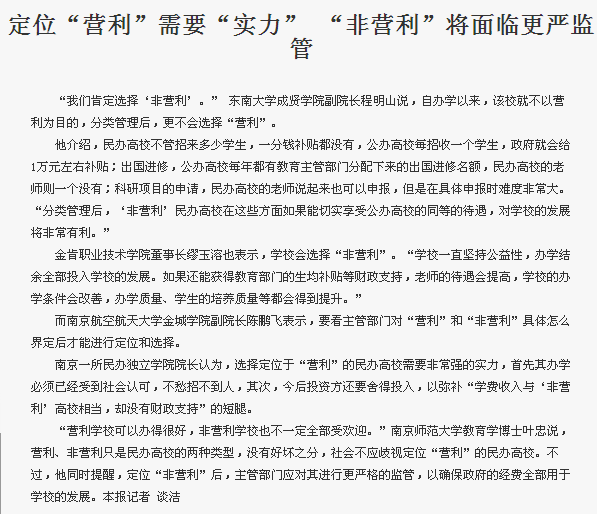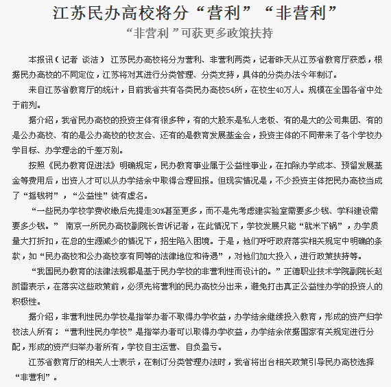 【南京日报】江苏民办高校将分“营利”“非营利”