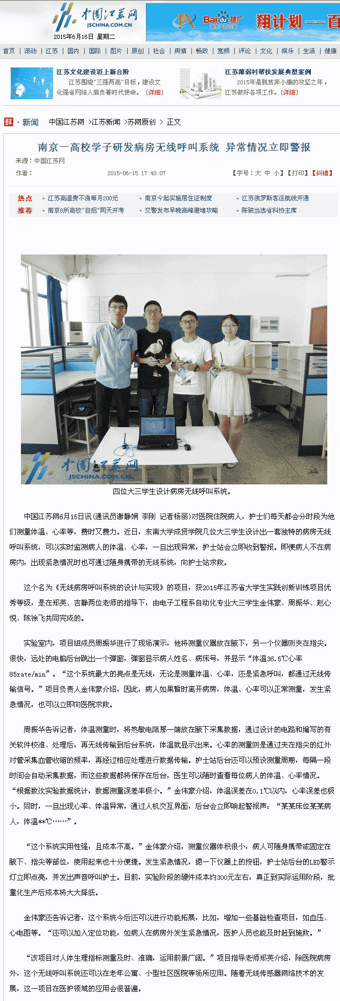 【中国江苏网】南京一高校学子研发病房无线呼叫系统 异常情况立即警报