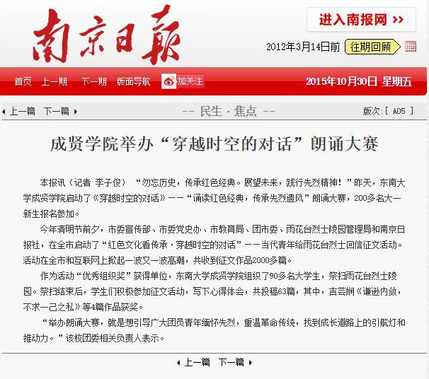 【南京日报】成贤学院举办“穿越时空的对话”朗诵比赛