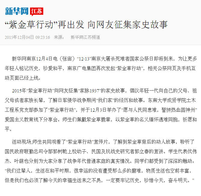 【新华网】“紫金草行动”再出发 向网友征集家史故事