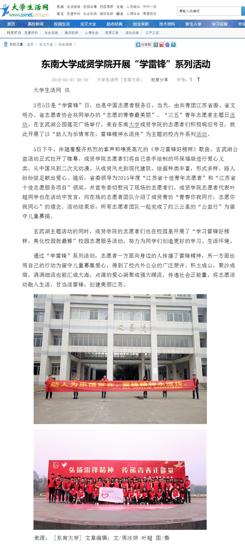 【大学生生活网】东南大学成贤学院开展“学雷锋”系列活动