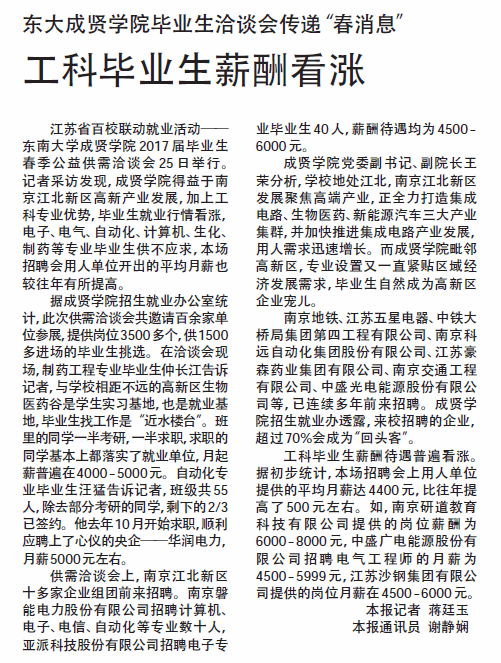 【新华日报】东大成贤学院毕业生洽谈会传递“春消息” 工科毕业生薪酬看涨