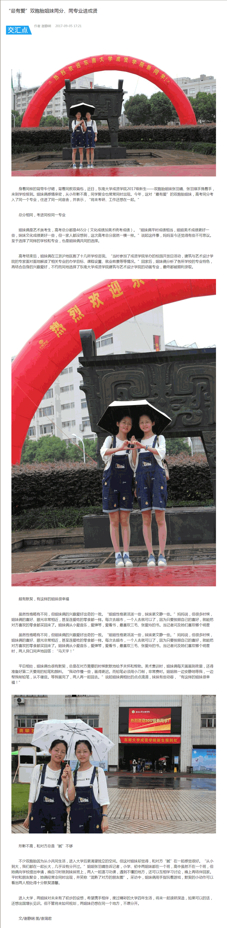 【交汇点新闻】“最有爱”双胞胎姐妹同分、同专业进成贤