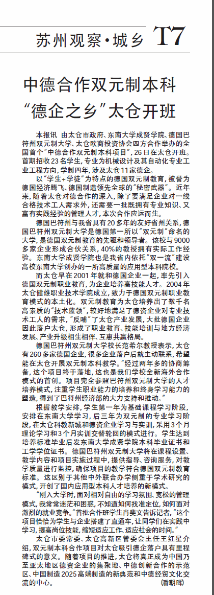 【新华日报】中德合作双元制本科“德企之乡”太仓开班