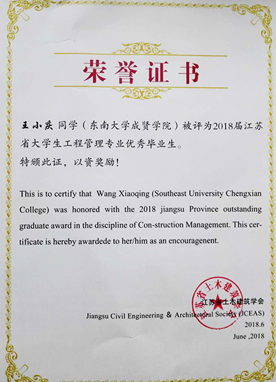 此次评比由江苏省土木建筑学组织,主要目的是为激励江苏省工程管理专业学生刻苦学习,奋发向上,同时也为积极创造尊重知识,珍惜人才的良好社会环境,培养更多、更好的德、智、体全面发展的工程管理专业人才。这次评比吸引了来自东南大学、河海大学、中国矿业大学、江南大学等数十所高校工程管理专业毕业生的踊跃报名,王小庆同学凭借扎实的专业功底和过硬的综合素质从众多参评者中脱颖而出,获此殊荣。