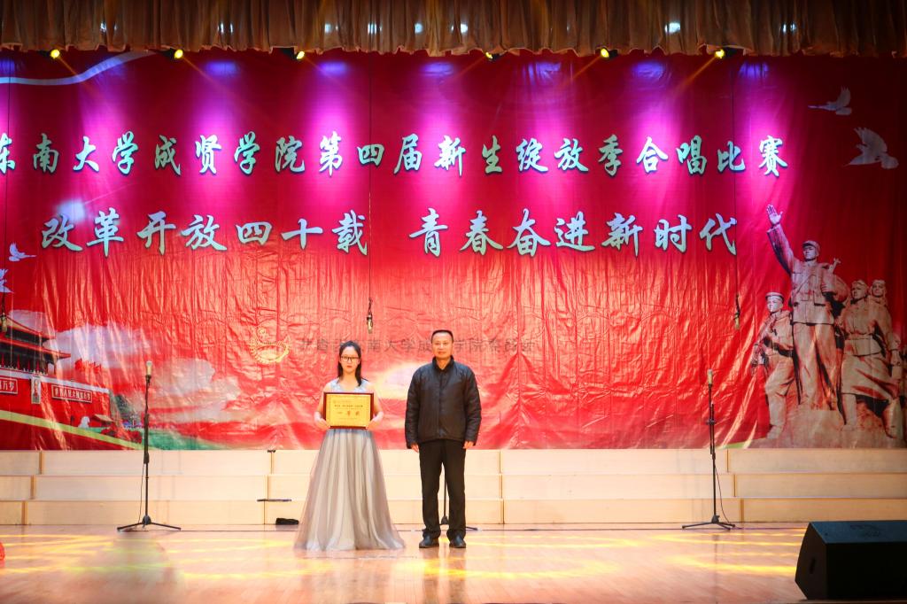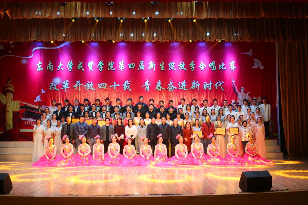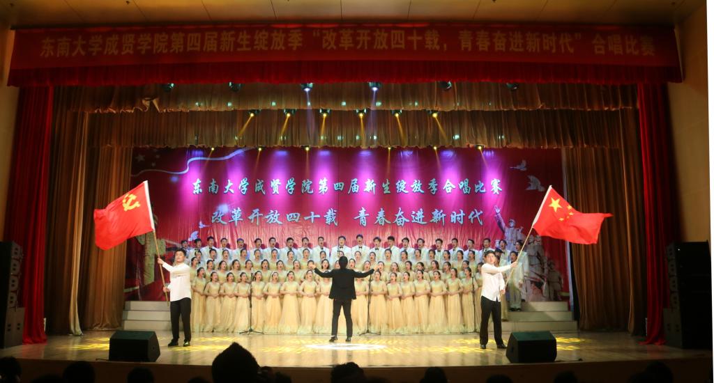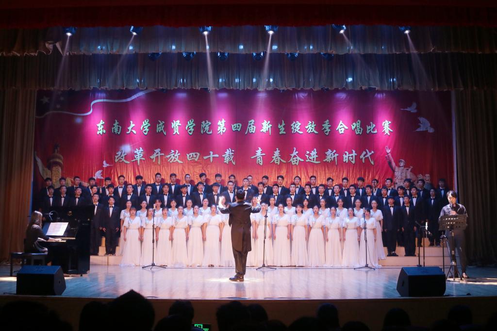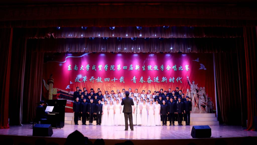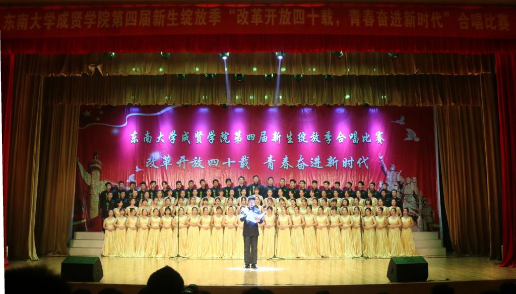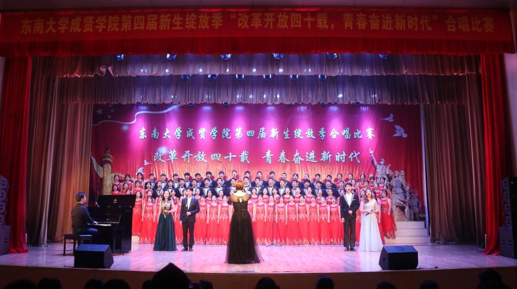 比赛中,大学生艺术指导中心音乐团倾情演绎歌曲《望春风》,展现了经典民谣的优美旋律;各学院老师积极参与指导与演出,师生们通力合作,用铿锵有力、激昂向上的歌声引发了观众对改革开放四十周年来伟大变革的共鸣,充分表达出成贤学子更加坚定走中国特色社会主义道路、改革开放道路的信心与决心。比赛在全场齐唱雄壮的《东南大学校歌》声中圆满结束。