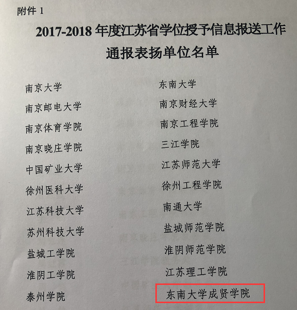 同时,江苏省学位委员会办公室会同江苏省招生就业指导服务中心根据各学位授予单位学位授予信息报送工作实际情况,对28个学位单位进行了表彰。我校重视学位授予信息报送工作,学位授予管理过程规范严格,确保了学位授予信息数据报送的及时性、准确性、完整性和规范性,此次获评“2017-2018年度江苏省学位授予信息报送工作通报表扬单位”。