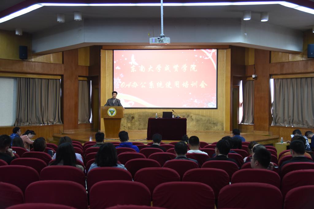 为进一步加强我校信息化建设,有效提升工作效率,5月8日下午,东南大学成贤学院OA办公系统培训会在真知馆报告厅举行。会议由党政办公室主任周伟荣主持,图档信息中心主任沈冬生以及各单位OA办公系统管理员共30余人参加了培训。