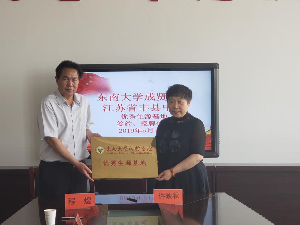 5月16日,东南大学成贤学院常务副院长许映秋,党委副书记、副院长王荣及徐州招生组老师一行前往徐州市丰县中学、徐州市丰县民族中学进行招生调研走访,并在丰县中学举行了“优秀生源基地”挂牌仪式。