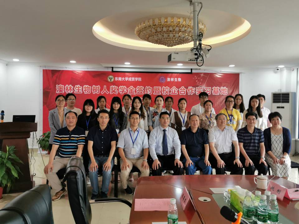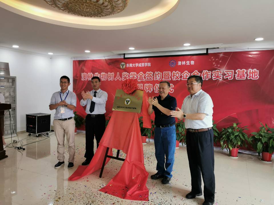6月20日,东南大学成贤学院“澳林生物树人奖学金”签约及校企合作实习基地揭牌仪式在南京澳林生物科技有限公司举行。成贤学院院长顾问程明山、党政办主任周伟荣、组织人事部部长姜宁光、制药与化学工程学院院长林保平、制药与化学工程学院党总支副书记周继荣、制药与化学工程学院“东大—成贤”科技创新平台主任姚刚,南京澳林生物科技有限公司总经理曾宪亮、副总经理张爱红、技术总监路爱成及部分中高层技术骨干出席了签约仪式。