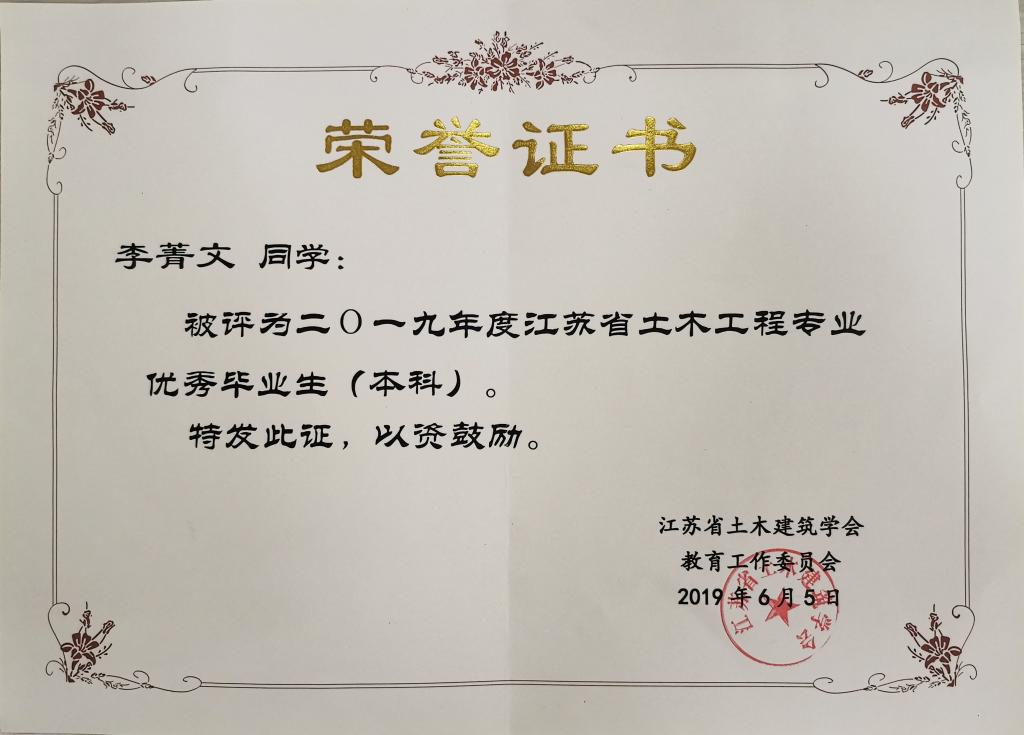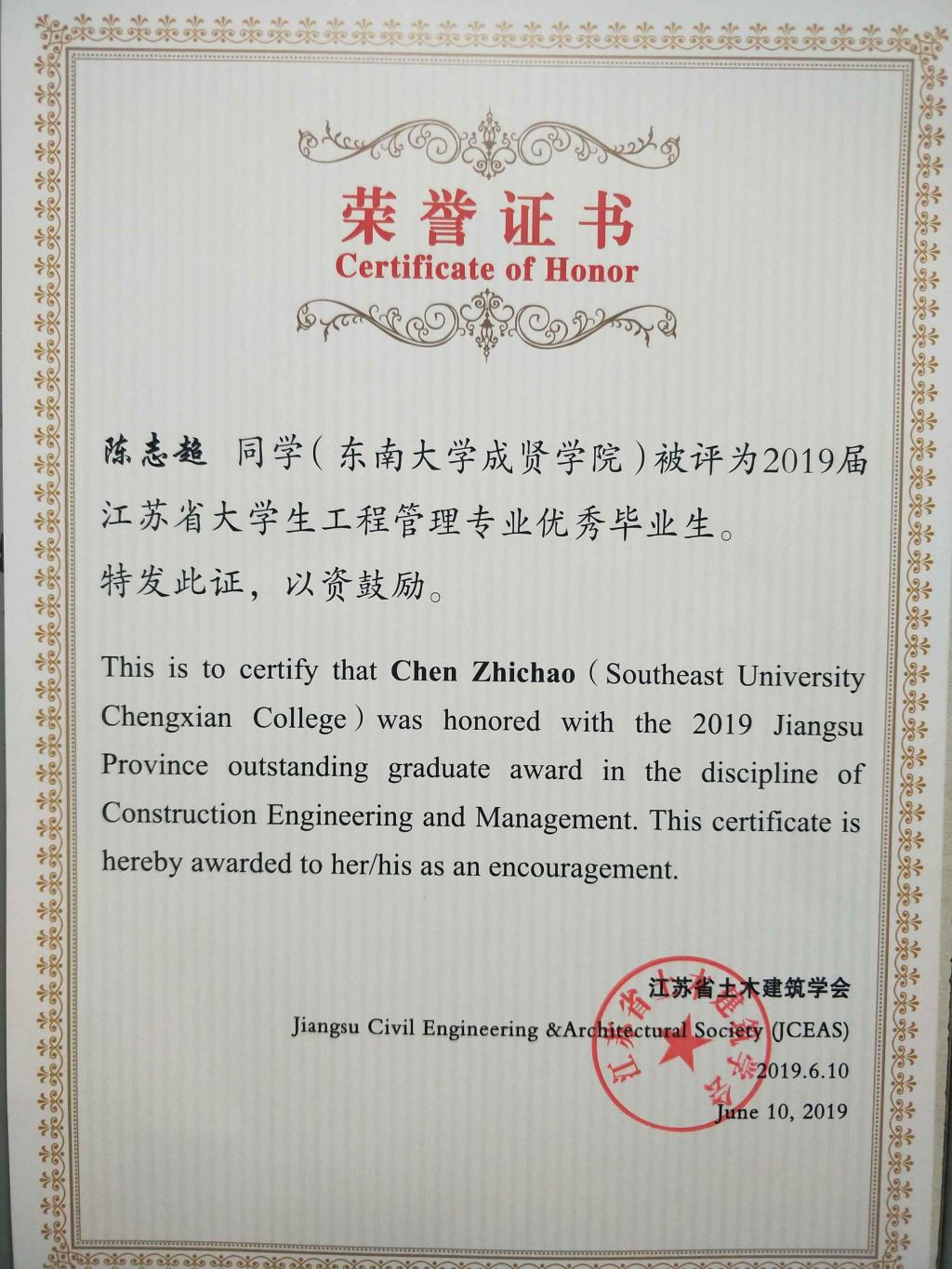 近日,从中国土木工程学会教育工作委员会江苏分会和江苏省土木建筑学会传来喜讯,东南大学成贤学院土木与交通工程学院2019届毕业生李菁文荣获江苏省土木工程专业优秀毕业生,陈志超荣获江苏省工程管理专业优秀毕业生。