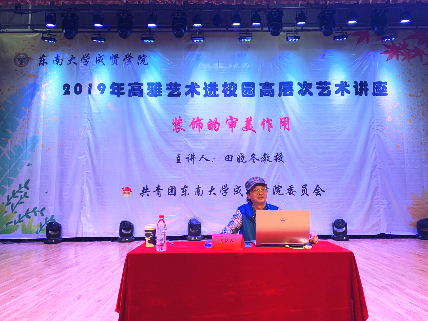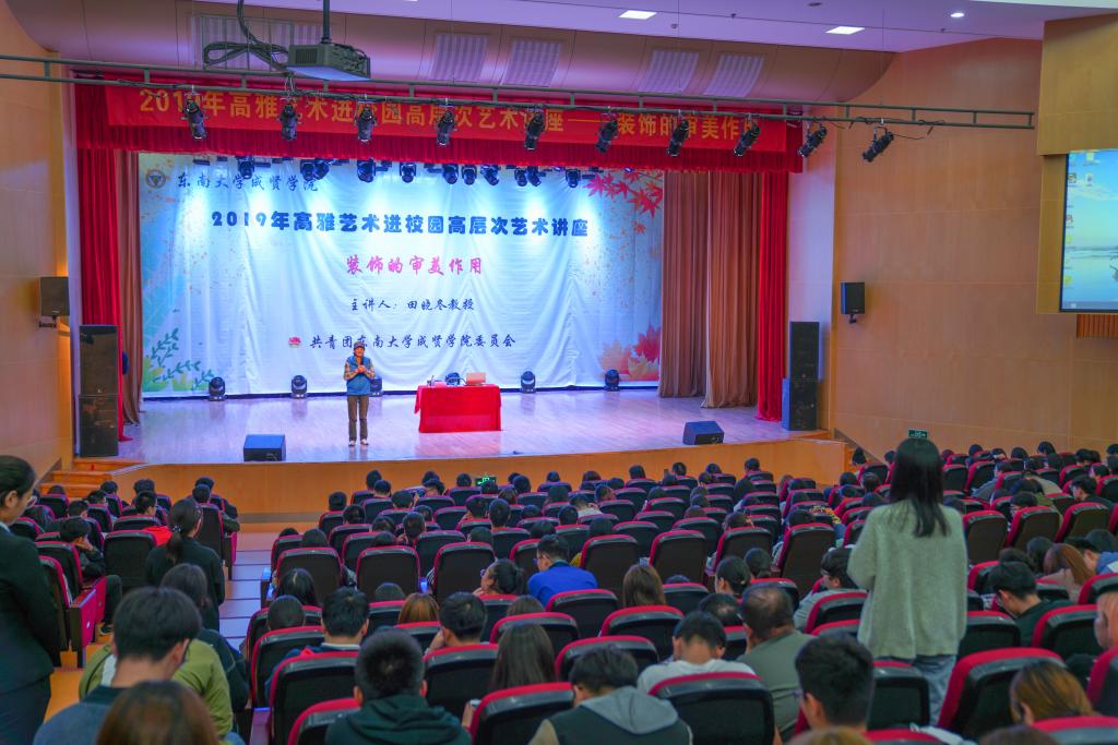 10月22日,由江苏省教育厅、江苏省财政厅和东南大学成贤学院团委联合主办的2019年高雅艺术进校园高层次艺术讲座之《装饰的审美作用》专题讲座在我校综合楼报告厅举行。讲座由南京林业大学艺术设计学院教授、研究生导师田晓冬担任主讲,全校600余名师生共同聆听了此次讲座。