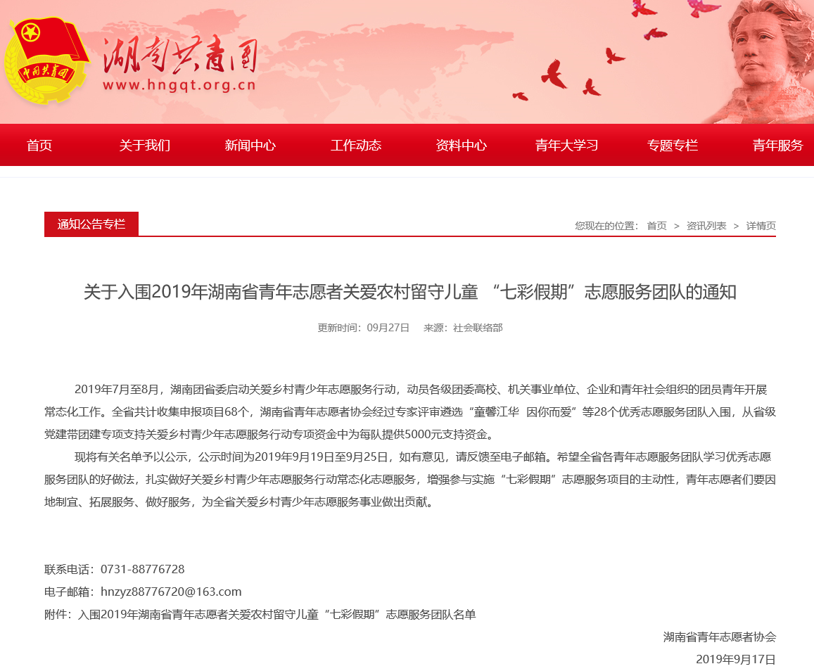 由电子与计算机工程学院2017级计算机科学与技术专业李帅同学担任领队的东南大学成贤学院暑期社会实践团队皮皮支教小分队,在2019年湖南省青年志愿者关爱农村留守儿童“七彩假期”志愿服务项目中获评“优秀志愿服务团队”称号,并得到5000元支持资金。