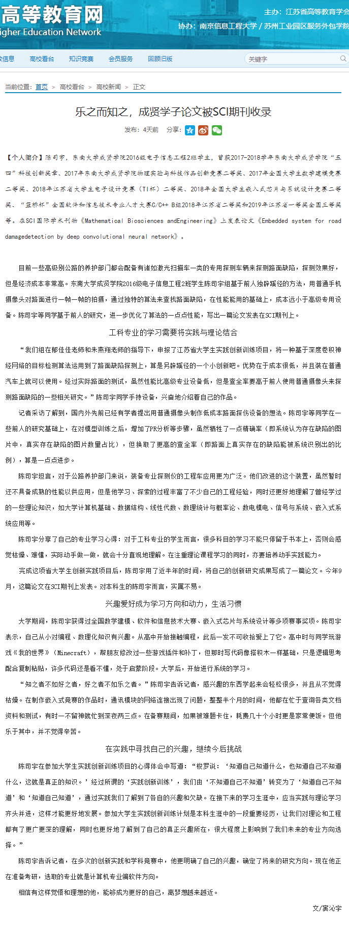 【江苏高等教育网】乐之而知之,成贤学子论文被SCI期刊收录