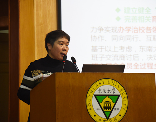 首先,常务副院长许映秋就“大学工大教学”育人机制实施工作做动员讲话。她指出,《东南大学成贤学院构建“大学工大教学”格局,建立健全全员全过程全方位育人机制实施方案》的印发和动员大会的召开,标志着我校“大学工大教学”育人机制的实施正式启动。她详细介绍了我校“大学工大教学”育人机制实施方案制定的背景、过程和基本框架,并向全校教职工提出三点要求:一要坚持协同融合,切实做到三全;二要坚持改革创新,勇于开拓、敢于突破、善于谋划;三要坚持政策导向,以人为本,保障可持续发展。