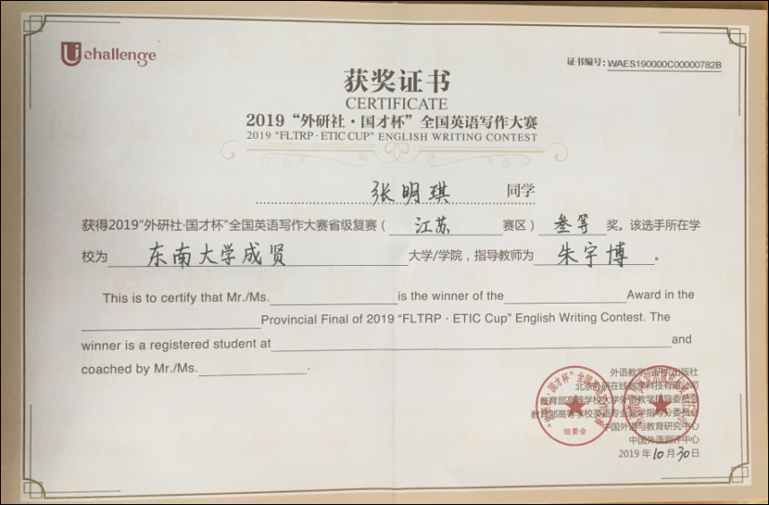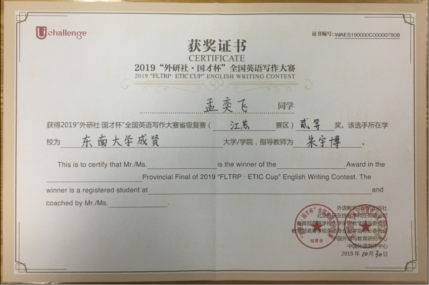 “外研社•国才杯”全国大学生英语挑战赛由外语教学与研究出版社、教育部高等学校大学外语教学指导委员会、教育部高等学校英语专业教学指导分委员会和中国外语教育研究中心联合举办,是为全国大学生打造的展现风采、实现自我的大型赛事平台。我校参赛学生在基础部英语教师们的悉心指导下从容应对、发挥出色,取得了骄人的成绩,展现了成贤学院大学生的风采与实力。