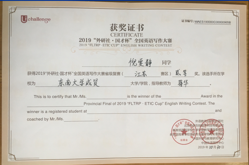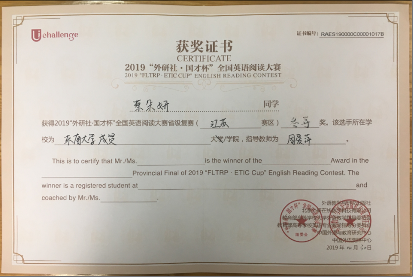该挑战赛分为英语阅读大赛、英语写作大赛和英语演讲大赛三部分,在江苏赛区英语阅读大赛中,73所本科院校共223名选手参赛,我校2017级会计1班邓一纯(指导老师:周爱萍)荣获一等奖,在全省名列第十一;2017级建筑工程1班孟奕飞(指导老师:朱宇博)获得二等奖;2018级国贸2班蔡朵妍(指导老师:周爱萍)获得三等奖。