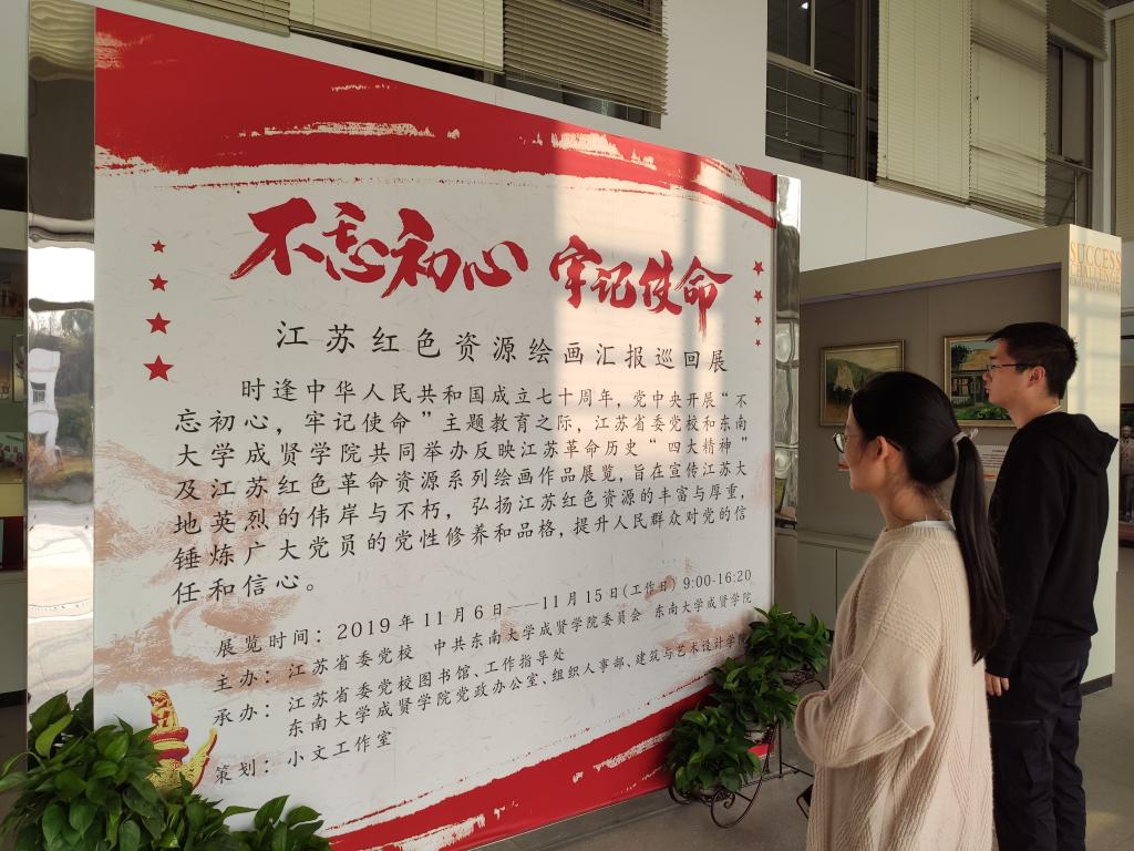 为庆祝中华人民共和国成立七十周年,进一步推进“不忘初心、牢记使命”主题教育,11月6日—15日,东南大学成贤学院与江苏省委党校在电工电子实验大楼二楼展厅共同举办了反映江苏革命历史“四大精神”和江苏红色资源绘画汇报巡回展。