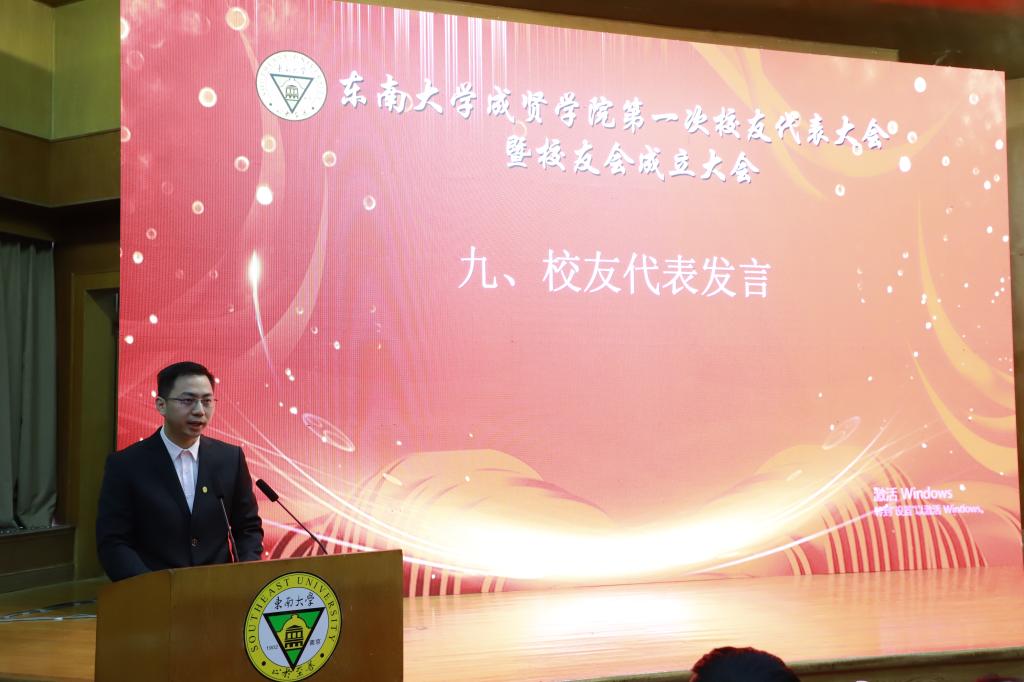 大会在东南大学校歌中拉开帷幕。首先,校友会筹备工作办公室副主任、校团委书记、人武部部长潘明烽汇报了东南大学成贤学院校友会筹备工作情况。随后,大会审议通过了《东南大学成贤学院校友会章程(草案)》,东南大学校友总会副秘书长曹军与东南大学成贤学院党委书记邢纪红共同为东南大学成贤学院校友会揭牌,邢书记为校友代表授予校友会会旗。接着,大会又审议通过了《东南大学成贤学院校友会第一届理事会成员建议名单》。休会期间,所有理事会理事参加了在真知馆105会议室召开的东南大学成贤学院校友会第一届理事会,并选举产生了东南大学成贤第一届理事会会长、副会长、秘书长、常务理事;聘任了校友会副秘书长、校友会办公室主任。