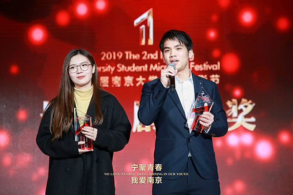 此次微电影节历时187天,27所院校提交总作品数量达211部。这其中不仅有在宁高校作品,还有以北京电影学院、中国传媒学院为代表的来自全国多所院校的高质量作品。我校共申报59部作品。经由组委会初审、专家评审,最终评选出本届大学生微电影节最佳影片以及专业组、非专业组共计14个专项奖。我校《青春有梦3》获得最佳剧情奖,并入围最佳创意奖、最佳剧情奖、最佳女主角三项提名,获奖团队李茂昌、张玥同学在台上分享了自己的创作心得。包括我校在内的东南大学、南京理工大学等12家高校获得优秀组织奖,8名同学获优秀作品奖。
