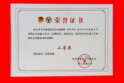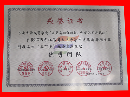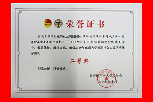 2019年东南大学成贤学院社会实践成果卓越,在江苏团省委社会实践总结表彰和东南大学社会实践总结表彰中荣获多项表彰。“百里南湖红旗飘,千载汉韵吴越扬”实践团荣获2019年江苏省大中专学生志愿者暑期文化科技卫生“三下乡”社会实践活动“优秀团队”;教师彭俊获评2019年江苏省大中专学生志愿者暑期文化科技卫生“三下乡”社会实践活动“先进工作者”。“青梦计划”实践团和“渡江战役及新中国成立七十周年对南京发展建设的变化”实践团荣获2019年东南大学暑期社会实践活动“优秀团队二等奖”。