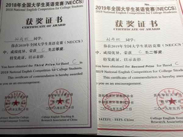 进入大学后,没有了高中繁重的学习压力和包袱,自主安排的时间也更多了。大一便设定好目标的她每天都在严格要求着自己,从课程的学习到课外活动的参加,她做到了自己要求的博学。志愿者活动中,她是辛勤助人的学生;聆听的每一次讲座和演出,都让她接受着文学和文艺的洗礼;图书馆的奋战,让她的知识面有了更广的范围。成功并不是偶然,而是牺牲了休闲娱乐时间得到的回报。在经过这样两年的努力后,终于实现了自己大学的一个梦想:大二获得国家奖学金。