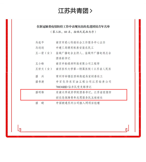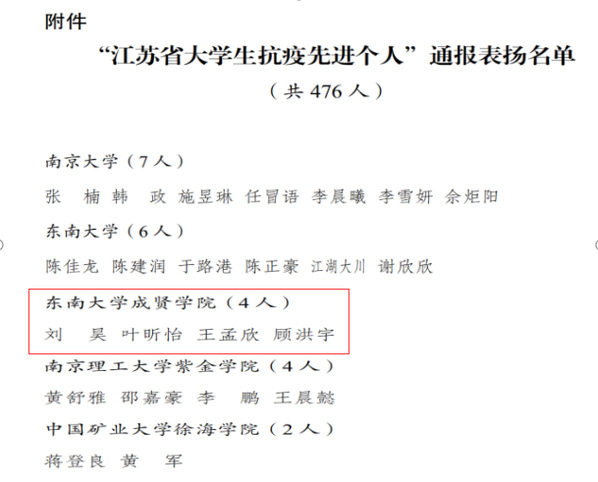 疫情是战场,青春永无畏,在阻击新冠肺炎疫情这个没有硝烟的战场上,成贤学子逆风而行,在全国各地发光、发热,为抗击疫情作出贡献,构筑起了抗击疫情的无形防线,获得了江苏团省委和东南大学团委的多项表彰。