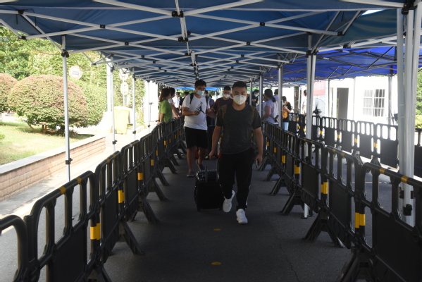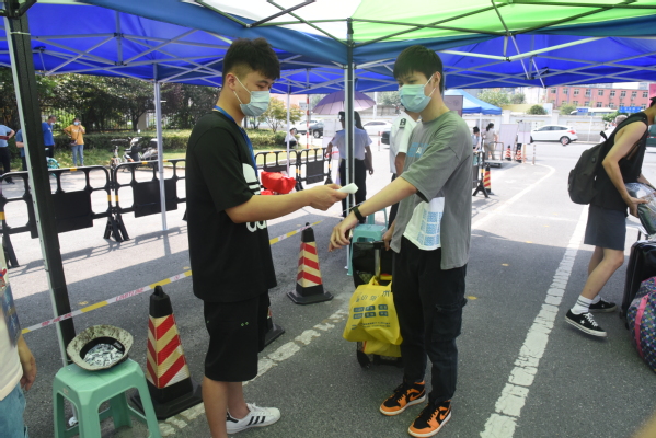 测量体温、出示苏康码、查验证件、返回宿舍……8月23日,东南大学成贤学院2020年秋季学期首批返校学生秩序井然地回归阔别已久的校园。
