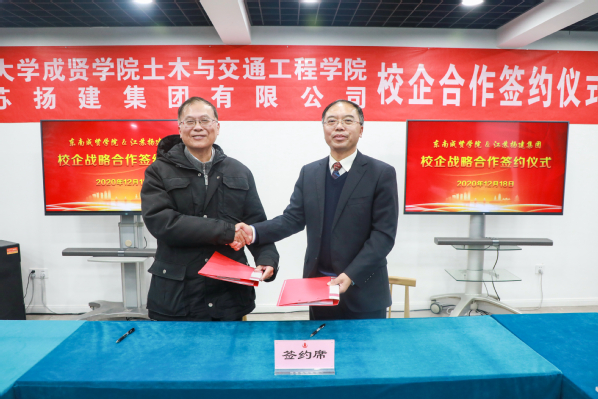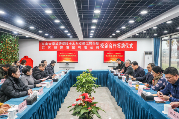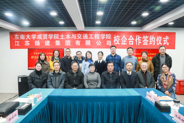 12月18日,土木与交通工程学院与江苏扬建集团有限公司校企合作签约仪式在江苏扬建集团有限公司举行。东南大学成贤学院常务副院长许映秋,土木与交通工程学院院长郭正兴、党总支书记杨阳、常务副院长郭应征、副院长温旭丽、综合办公室主任石城以及各系主任、骨干教师,江苏扬建集团有限公司总裁梁云彪、总经理邹厚存、党委副书记张振兴、副总裁杨志娟、人力资源部部长孔凡裕、总经理助理王荣以及各分公司负责人出席了签约仪式。活动由扬建集团党委副书记张振新主持。